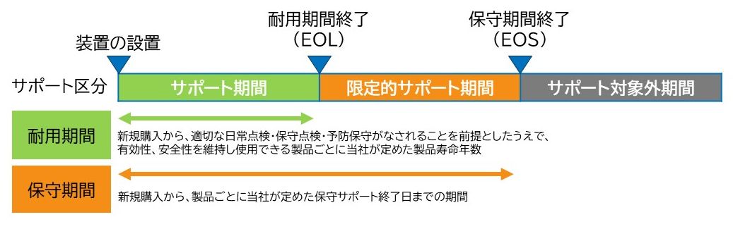 当社が製造・販売する機器製品のライフサイクル全体を通じて、サイバーセキュリティ脅威に対する適切な対応を実施いたします。製品の耐用期間終了 (EOL: End of Life) およびサポート終了(EOS : End of Support)に伴い、以下の方針に基づいて対応いたします。