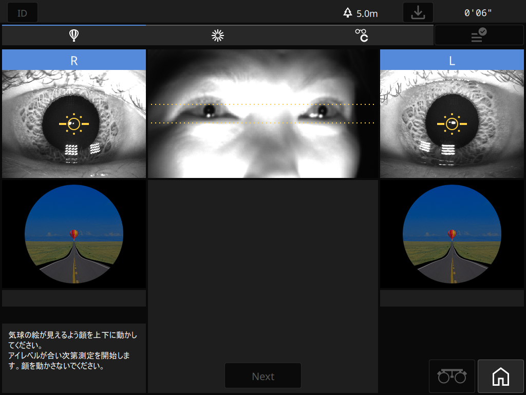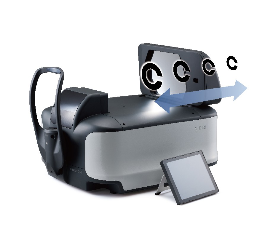 | 両眼開放の他覚測定により、意図しない器械近視や調節介入を抑えつつ、自然な瞳孔径で日常視に近い視環境での測定結果が得られます。 | PHANTOM上で得られた他覚測定値をもとに自覚測定をおこないます。両眼視状態を保ちながら自覚測定することで、調節の影響を抑え、より実用度数に近い測定値を得ることが期待できます。 |