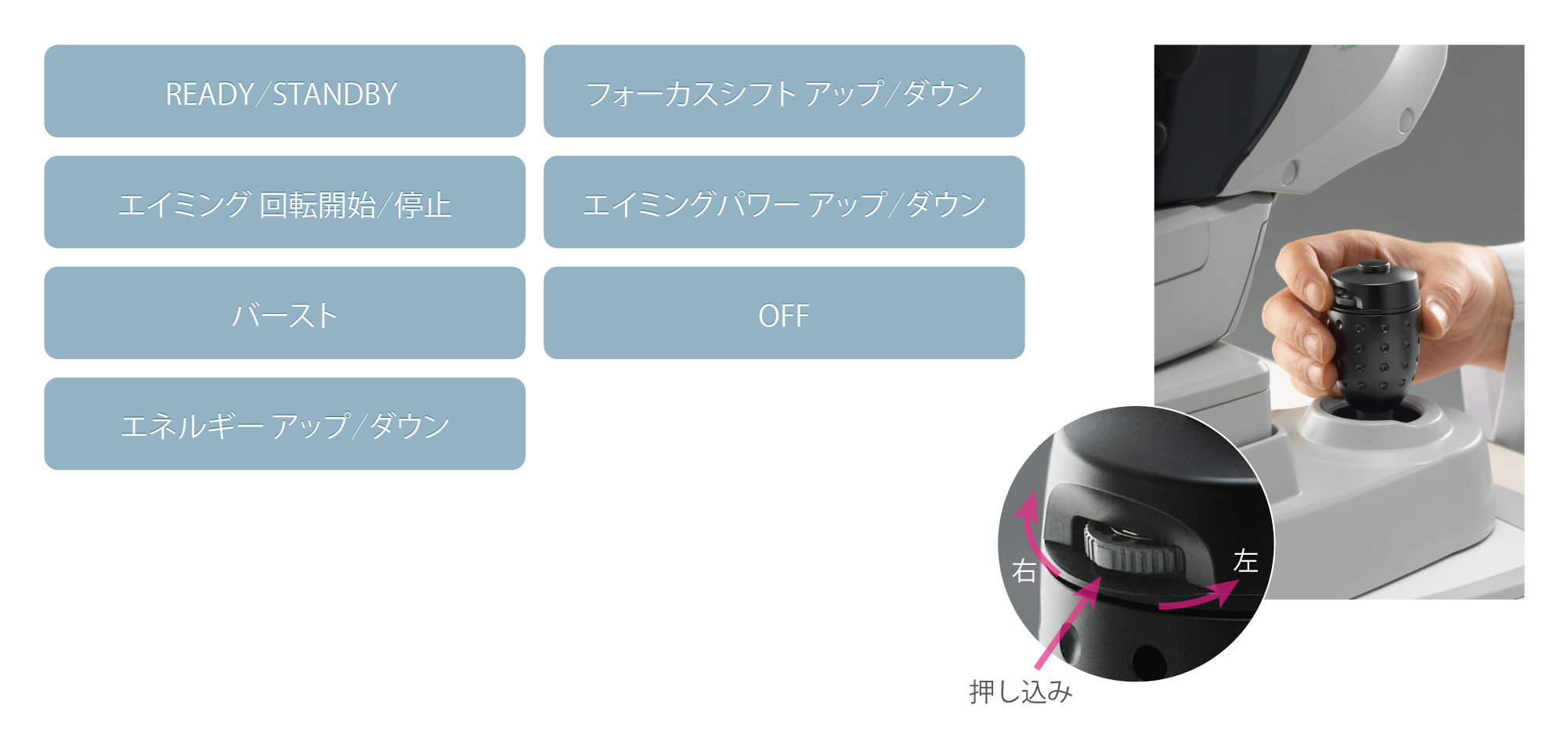 ジョイスティックから手を放さずに操作可能です。どの操作をおこなうかを事前に設定します。(3つまで)