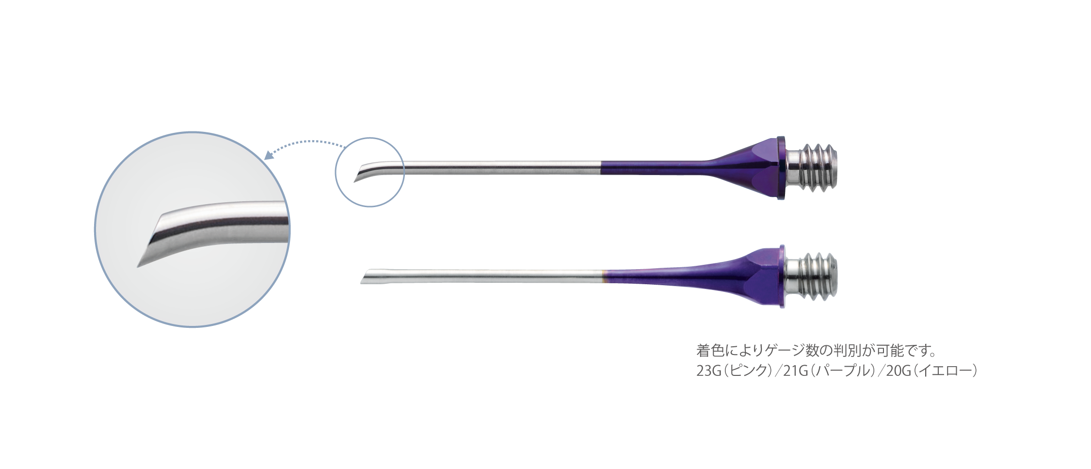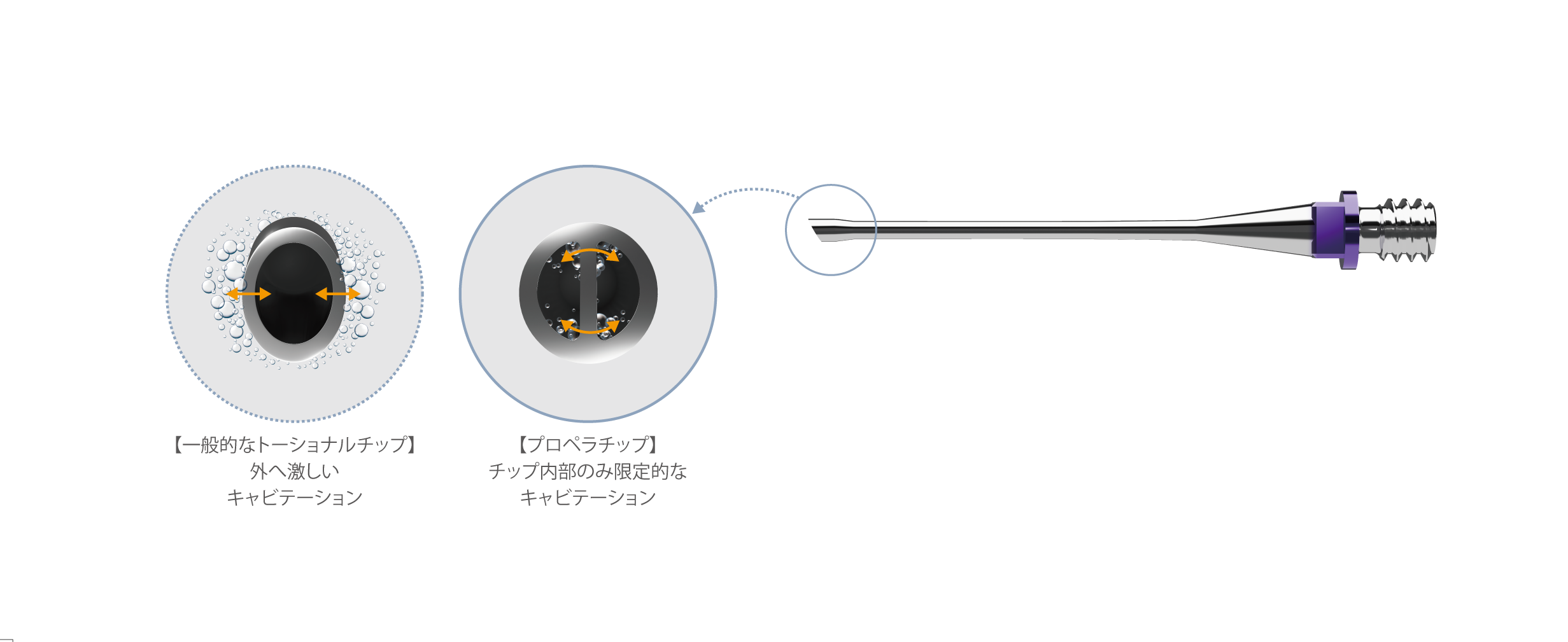 ストレートチップに近いデザインでねじれ振動を実現しました。チップ先端のみを曲げることで発熱を抑えつつ、ねじれの振幅が確保できました。チップサイズは23G、21Gがありディスポタイプ、リユースタイプが選択できます。STDチップ(ストレート)は23G、21G、20GがありGyro ハンドピースにも使用可能です。