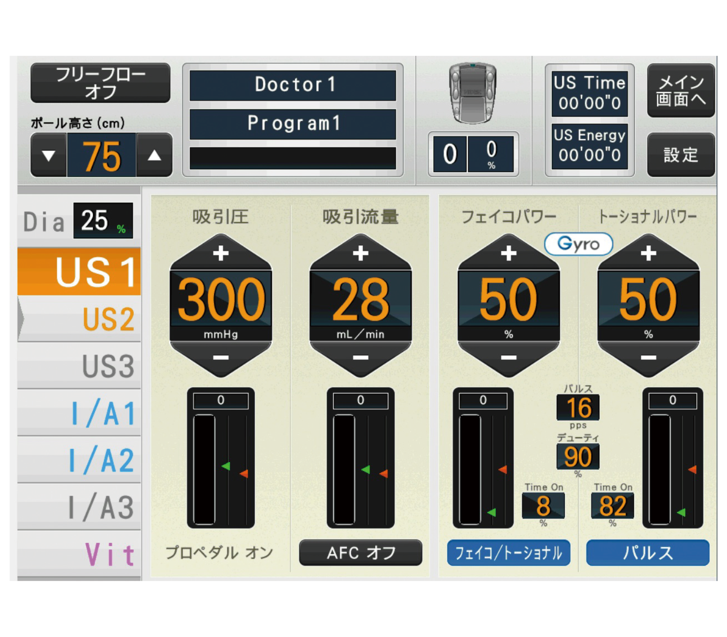 フットペダルポジションごとに吸引圧・吸引流量・USパワーを別々に設定でき、多彩なパラメータ設定が可能です。