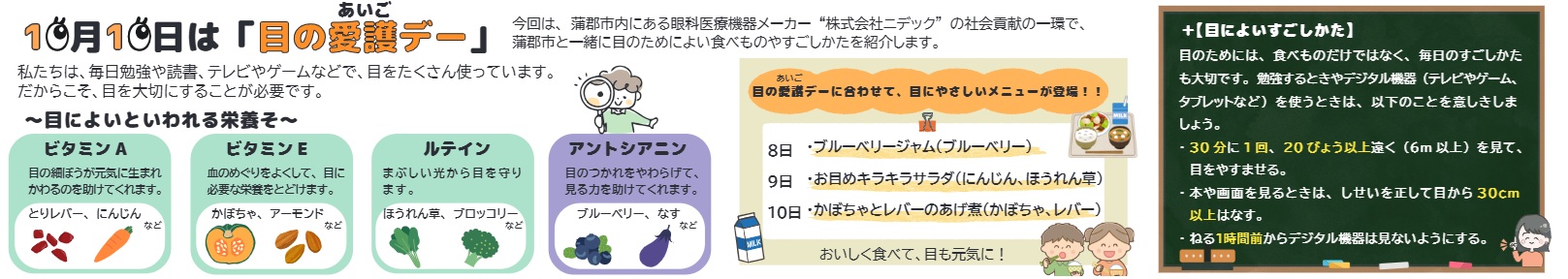 蒲郡市内の保育園・小中学校の給食献立表に、目の健康に関するコラムを掲載。目に良いとされる栄養素、目に良い過ごし方を紹介し、子どもたちや保護者の皆さまに、日常生活の中で目をいたわる習慣づくりを促します。![]() |